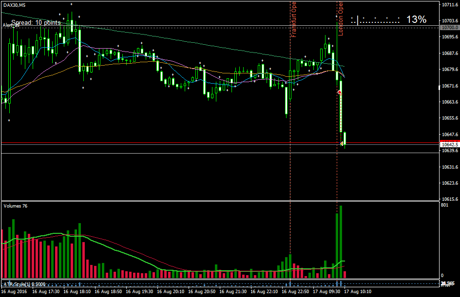 Re: Diario de SintesisMirando el grafico diario del dax, las dos ultimas velas son de rango estrecho y alto volumen relativo. Esto indica debilidad. Con lo que es posible en breve veamos caidas. Si el volumen hubiera sido de compras, la velas serian de mayor rango y alcistas. Voy a intentar mirar el volumen real en vez de el tick volume.