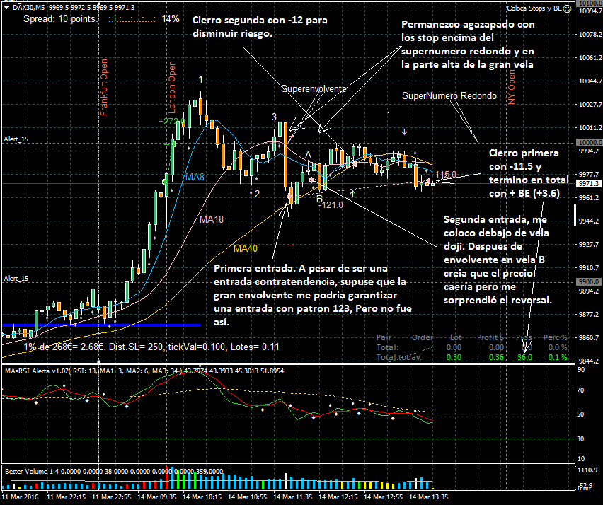 Re: Diario de SintesisEn lo que va de mañana, en la primera operacion entré lejos del punto optimo, la segunda, tratando de compensar eso, si estaba bien situada, pero todo a costa de aumentar el riesgo. Eso me desequilibró un poco emocionalmente y queriendo cerrar en BE entre las dos, lo hice con -10. Si hubiera tenido suficiente temple podria haber cerrado con buenas ganancia. Acepto la perdida y espero pacientemente nueva opotunidad.