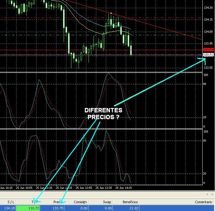 Y el Disparo del TP?Abri una posicion SELL en EURJPY, coloque mi SL y TP como lo muestra la grafica, en cierto y repetidamente momento el precio alcanzo el precio objetivo y hasta lo paso sin que se disparara el TP. En los datos de la vela, se puede apreciar que alcanzo el minimo de 133.69, varios pips por debajo de TP. La pregunta: Esto es Normal? A que se debe esto? Ducke