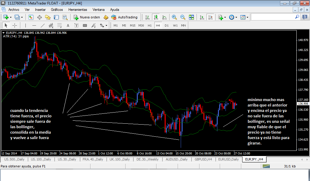 Una imagen de mi manera de ver las divergencias, lo que explico en este hilo. Otra de las que opero por aburrimiento, donde el macd en el segundo máximo ni siquiera toca su media de 9. Y la última, para los que buscan el giro de la tendencia. Por favor, no os fijéis en un indocador que os diga cuándo la tendencia se está quedando sin fuerza, fijaos en el precio. Las bollinger para esto son un clásico y funcionan muy bien. Eso sí, hay que entrenar el ojo.