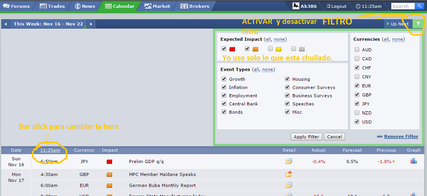 Muchas gracias dacontrader. Había encontrado el calendario pero en http://www.fxstreet.es/calendario-economico/ . Lo que sí no sabía era que haciendo clic en esas noticias te explicaban como afectaba la moneda. Mil gracias