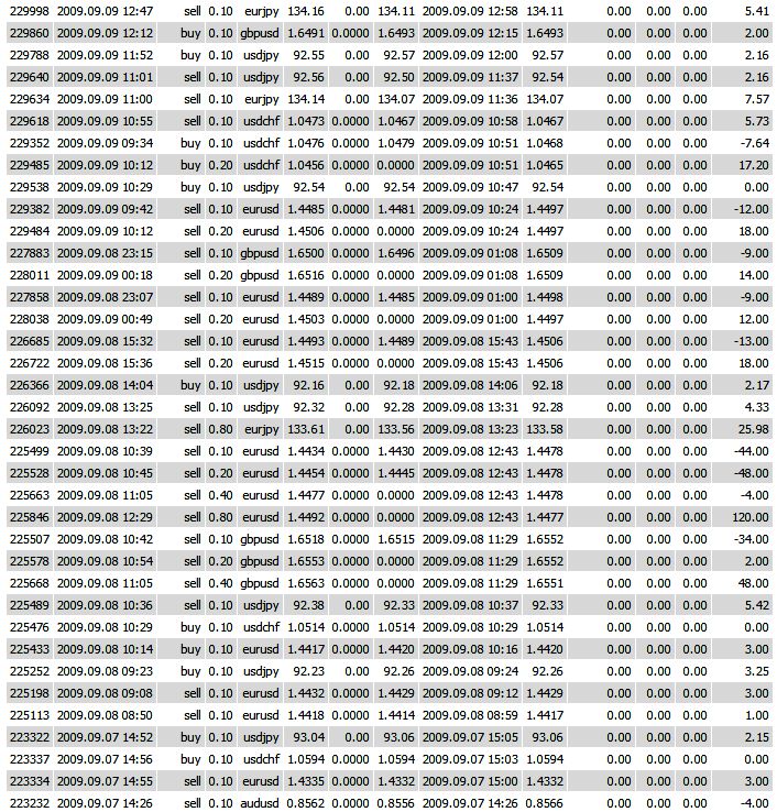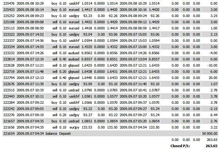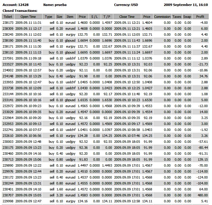 Si hacemos cuentas 2% por 20 dias habiles para operar al mes, nos daria 40% de la cuenta... que es mucho en mi opinion.. como dijo alguien hace unos post... este sistema solo saca 15 Pips por sesion... que es suficiente para darte mas del 1% de la cuenta en un solo dia... ahora en mi experiencia pude notar que facilmente en 2 horas habias hecho en un dia normal 4 a 5 operaciones... cada una por 5 pips... ya solo calculas cuanto te harias.. Bueno monto el historial para que vean que no es paja lo que hablo. ![]() Continuare ya operando en otra cuenta ... con todo lo que aprendi esta semana... Muchas gracias Ninpu por mostrarme este sistema....GanandoPips muchas gracias por tus explicaciones....y Jhon (axisnet) gracias por la paciencia cuando te cogia con la preguntadera....se que cada uno me ha ayudado mas de lo que puedo escribir en un simple parrafo. P.D. Quiero operar la original con todas las reglas... para porder mirar si puedo hallar una desviacion a esta estrategia que sea para mi mas beneficiosa...la variante que tiene ninpu es muy buena, pero deseo mirar si puedo hallar mi propia variante ganadora. Última edición por lebanen el 12 Sep 2009, 01:20, editado 1 vez en total