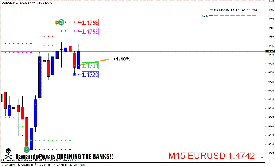 OK Mariano por mi no hay ningún problema en responder... En el EUR/USD es el 1.4619 y en el USD/JPY es el 90.53, el indicador siempre siempre siempre está marcando un punto rojo arriba como resistencia y uno azul abajo como soporte, pues en esos mismo me fijo. ¿Qué uso para entrar? pues el trigger... fijate que son sells y la vela cruza el trigger cuando está roja... eso es lo que busco, que el open de la vela se mantenga en ese rango de 5 pips entre el trigger y el S/R.