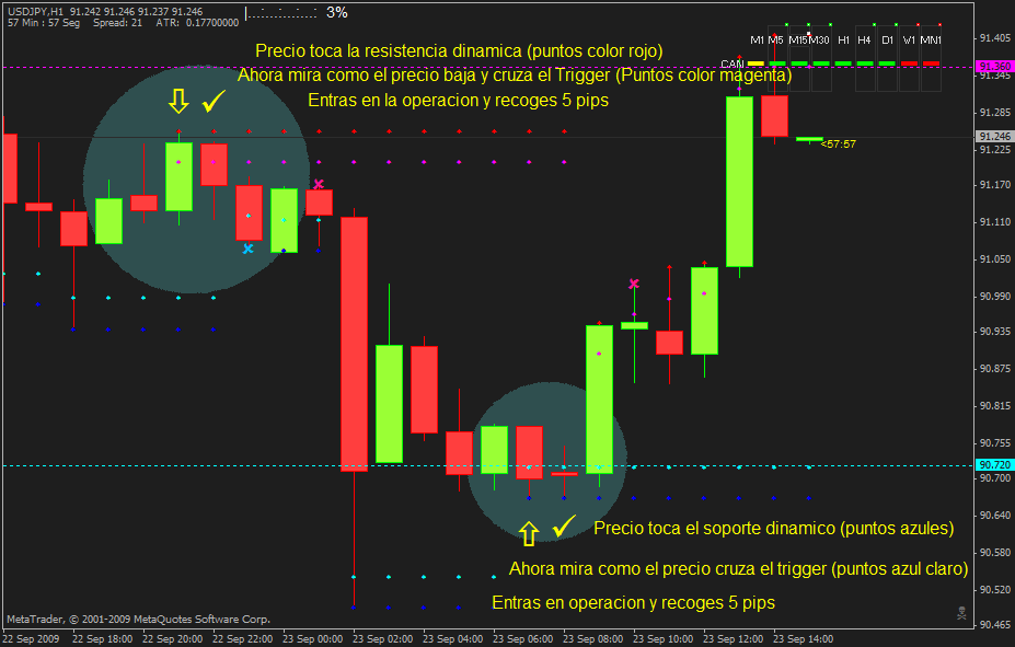 Resumen: Entras en la operacion cuando el precio toque el Soporte/resistencia dinamico y luego busque los Triggers, cuando estos sean cruzados entras y buscas 5 pips de beneficio... Resistencia dinamica: Color Rojo Soporte dianamico: Color azul Trigger de venta: Color Magenta Trigger de compra: Azul cielo Si el precio no ha tocado el soporte/resistencia dinamico no entras....el precio en ocasiones toca los triggers pero debe ser como te enseñe no de otra forma..En ocasiones el precio toca el soporte/resitencia dianamico con una sola barra y luego toca el trigger, en esas operaciones yo entro..pero tu debes acostumbrate de momento a entrar en las que te mostre en la grafica esas se llaman reversals y son mas seguras.