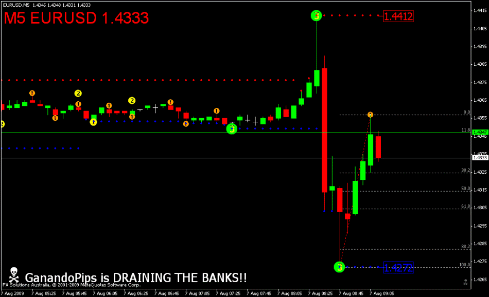 http://www.kreslik.com/forums/viewtopic ... 44&start=0 ; 1) Only trade if there is a 1, 2 or 3 semafor on the current or previous H1 candle. NO EXCEPTIONS. SINCE THE PREVIOUS H1 CANDLE HAS A SEMAFOR - GBPUSD IS IN PLAY. 1) Solo comerciar, SIEMPRE y UNICAMENTE si hay 1, 2 o 3 semaforos en la vela en curso o en la anterior en 1H. 2) After you see the semafor on the H1 chart, look at the M15 chart for the long(light blue) and short(pink) triggers based on TRO DYNAMIC FIBS SR TRAIL indicator. 2) Si hay semaforo en el gràfico de H1 se comprueba si en el de 15M hay disparadores de compra (líneas azul claro) y de venta (líneas rosadas), basados en el indicador TRO DYNAMIC FIBS SR TRAIL. 3) When price touches the trigger you enter. DON'T THINK, JUST ACT! 3) Cuando el precio toca el disparador usted debe entrar inmeditamente: ser rápido es importante en este sistema. 4) Only ONE TRADE PER M15 CANDLE. If price goes against you, just wait. 4) Sólo UN NEGOCIO POR VELA en 15M. Si el precio se va en contra simplemente espere. 5) If price went against you and makes a new dynamic sup/res level, get ready to enter at the trigger. If you can't see how this works, then DO NOT TRADE IT. I have entered up to 3 times. 3) 5) Si el precio le fuera en contra de y hace un nuevo nivel dinámico de RES/SOP, preparese para entrar con el disparador. Si usted no entiende este sistema NO LO NEGOCIE. 6) What's the STOP LOSS? The stop loss is your maximum allowed loss per trade based on your money management. 6) El Limite de pérdida (STOP LOSS), será su máximo la pérdida permitida por comercio basado en su gestión de riesgo. O sea: lo que este dispuesto a perder en un negociado, una entrada. RISK/riesgo = POSITION SIZE/Volumen (0.01, 0.5, 1.0…) * STOP LOSS/pips de stop loss STOP LOSS/límite de pérdida de una orden = RISK/riesgo / POSITION SIZE/volumen 7) What's the TAKE PROFIT? You take what you can. I usually take 5+ pips and leave more on the table. 7) ¿Cuál debe ser el BENEFICIO a TOMAR? Usted tomará lo que pueda. Por lo general 5 + pips sería lo correcto trabajando en esta temporalidad (15M) con esta estrategia. Try this method using a micro lot or 0.1 mini lot. Trade it this way until you feel comfortable and are profitable on a consistent basis. Just trade it, AS IS, and don't add anything to it to improve it. You'll be amazed at how profitable a simple method can be. - Intente este método usando un lote minimo (volumen 0.01). Pruebe hasta que usted se sienta cómodo y gane mas que lo que pierde, y de manera estable. Siga estas reglas estrictamente, sin improvisar ni cambiar nada (si no no sabrá que es lo que falla). YOU DON'T HAVE TO SWITCH TO M5, YOU CAN USE THE TRO MULTIMETER CANDLE COLOR. USTED NO TIENE QUE CAMBIAR a M5, USTED PUEDE USAR EL COLOR DE VELA DEL “MULTIMETRO DE TRO”. BUT ONE MUST DO IS TRADE WITH THE PRICE DIRECTION AT THE TIME. IF D1 AND H1 ARE GREEN BUT PRICE IS GOING DOWN THEN YOU SHOULD BE SHORT. JUST BE CAREFUL. PERO DEBEMOS COMERCIAR A FAVOR DE LA TENDENCIA PRINCIPAL que da 1D SI D1 y H1 INDICA TENDENCIA ALCISTA PERO JUSTO EN ESTE MOMENTO EL PRECIO VA A LA BAJA, CORRIGIENDOSE; DEBEMOS ENTRAR A VENDER EN 15M, NUESTRO TF DE TRABAJO, PERO SIENDO MUY CUIDADOSOS. Recuerda: Obtenemos datos de 1D, 1H, etc, pero ponemos las ordenes en 15M. Última edición por Estrada el 07 Ago 2009, 22:51, editado 1 vez en total