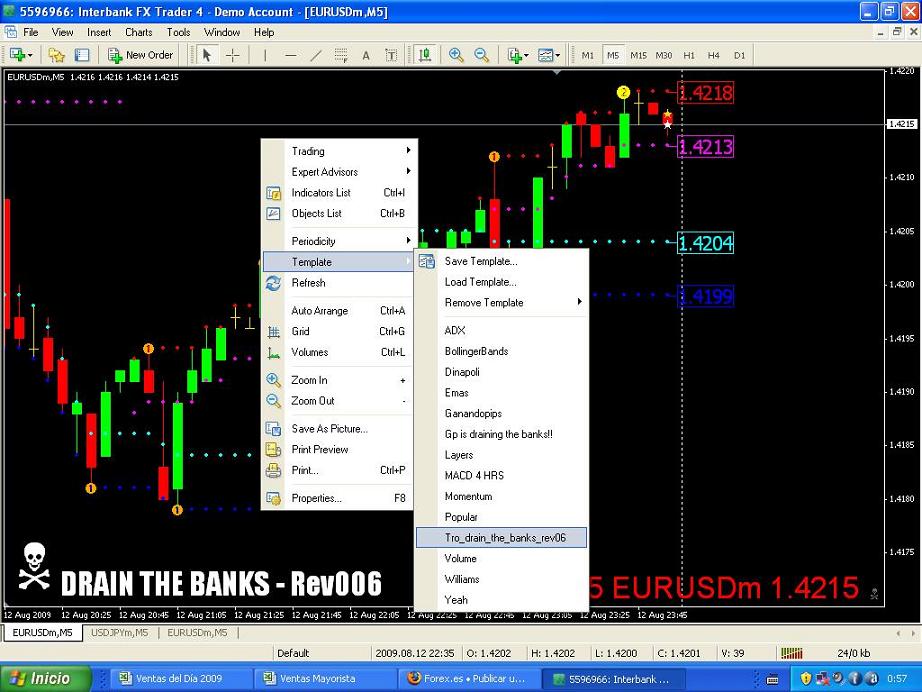 En Templates fuera de experts, el primero que te topas al navegar la carpeta del MT4. Cargar la plantilla es abrirla en el gráfico, abres un gráfico nuevo, le das click derecho, Template y buscas en el menú que te aparece el nombre del template de DRAIN THE BANKS. "Al final de cuentas, el trader es un gestor de riesgo..."