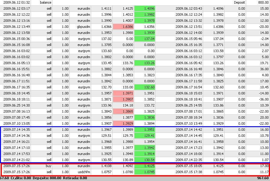 14 JULIO = REVOLUCION FXwizard, Haciendo caso omiso a tu recomendacion me levante con el deseo de dedicarme 100% a la operatoria y a hacer minimos 50 pips. Siguiendo mi operatoria, En EURUSD Revise los TF de D1 y H1 y marque RS y Comportamiento del Mercado y lo mismo en M5. Observe unos rangos en los TF grandes y en 5M un pequeño Canal bajista, dentro de ese rango. Espere que el precio rompiera ciertos S o el Canal y entraba, esperaba la subida y cuando volvia a caer entraba de nuevo. Asi hice varias operaciones. Sin considerar el Stoch, solo el Precio y los EMAs. En la grafica se muestra la situacion de Ayer... Despues de un descanso, entre de nuevo al PC y sin pensar mucho abri una operacion EURJPY...Estuvo perdiendo 27 puntos! Todo por volarme los pasos y no tener calma ni analizar, tratar de verla facil. Al final corriendo los SL y TP Gane 1. Anexo Resumen Operaciones del Ultimo Mes, dentro del cuadrado azul las operaciones de ayer y en rojo las que llevo hasta hoy (Por porblemas con el computador no pude entrar mas temprano). En resumen en la Fiesta Nacional Francesa, tuve 6 Operaciones 6 Ganadoras y 61 puntos Hoy llevo 2 Operaciones 2 Ganadoras 28 Puntos Debo agradecerte por tus consejos y por este espacio, me ha ayudado mucho. Espero tus observaciones y consejos. Ducke