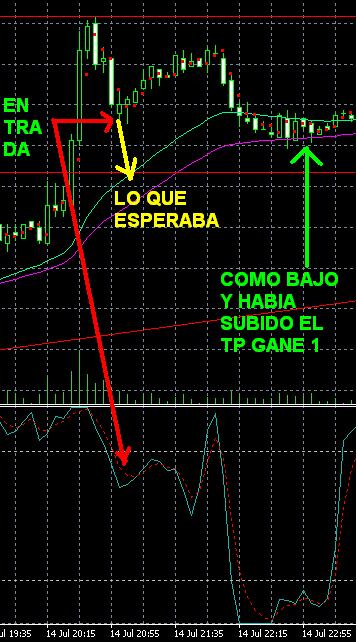 Hoy realice 2 operaciones, una positiva y otra negativa. Primera: Aunque no pude entrar al mercado cuando se debia, estaba ocupado en otras cosas y alejado del PC, despues de ver la grafica D1 y la Grafica M5, decidi entrar como nuestra la grafica... ¿Que paso? El precio estuvo a 2 pips de alcanzar la meta pero no llegaba, se devolvia y volvia a intentar. En esos momentos que llevaba temporalmente ganado 18 pips pense cerrar la operacion con esa ganancia pero me dije "No seas cobarde". Me aleje del equipo para no sufrir. El precio se devolvio totalmente y activo el SL. Una pregunta: ¿Sera que para no perder buenas oportunidades como la de la grafica hay que estar pegado al PC?