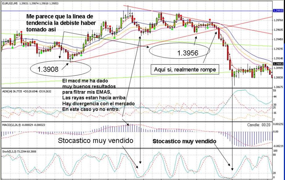 Re: Ducke buscando un TutorHola mi querido Ducke, me permito darte un par de sugerencias con mucho respeto y con la venia del gran FXWIZARD, creo que la linea de tendencia la debiste haber tomado un poco mas larga asi te hubiera dado mas vision del mercado y podrias haber visto el momento de ruptura de la misma, en la primera entrada me extraña mucho que hubieras entrado con el stocastico asi, me parece que estaba muy vendido, cuando el estocastico es tu filtro Rey, en la segunda entrada el estocastico vuelve a estar abajo y ademas ya estabas fuera de los parámetros de tu estrategia y yo se que esta parte si la tienes bien reclara, bueno solo puedo concluir que todo esto es consecuencia de las emociones, emociones, emociones, ya estrada lo escribia por ahi que falta un tema sobre esta parte de la psicologia, pero sera que alguien si nos puede enseñar como manejar nuestras emociones. Bueno seguimos aprendiendo de nuestros propios errores los cuales estoy seguro un 95 % son causados por nuestras emociones emociones.