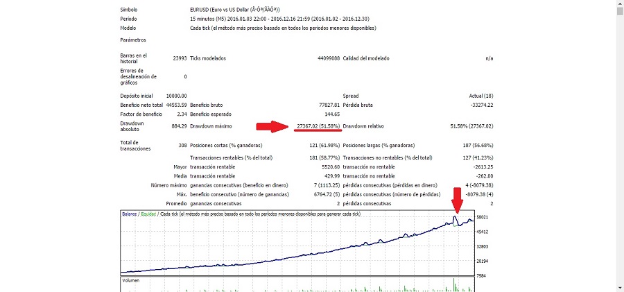 estoy probando y configurando un expert advisor, pero cuando me da los resultados del backtest no tengo claro el tema del drawdown ya que los resultados dicen DD maximo de 51,8% y yo viendo el grafico y los resultados de las operaciones veo que la perdida mas grande fueron unos 8000 cuando el capital estaba en los 58000 por lo que me da una perdida maxima del 13,8%. Yo entendi que el DD maximo es la perdida mas grande que has tenido y contando con el capital que tenias en ese momento, quizas no es asi. Si por favor alguien pudiera aclararmelo. gracias, adjunto una foto para mostrar lo que digo