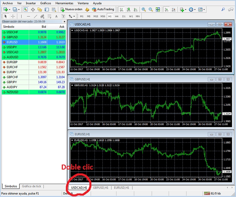 Re: duda con grafico en metatrader 4Hola mulepe yo tampoco pude ver esa clase de archivo (para verlo hay que bajarse la app “OpenDocument Reader” por Play Store. Igualmente te entiendo perfectamente porque tenemos los mismos gustos, ver una divisa a pleno. Para esto: haces doble clic izq. en los zócalos que aparece debajo de la ventana principal (adjunto foto) con el nombre de cada divisa elegida. De paso te enseño como adjuntar archivos “.jpg” desde tu PC: abre tu MetaTreder4/ busca en tu teclado la tecla “Inpr pant petSis” y mantenlo apretado unos segundos (para sacarle una foto a tu pantalla completa)/luego te vas a inicio/todos los programas/abres la carpeta Accesorios/y abrís el programita Paint/presionas “Control+V”/acá tienes que aprender si o si a: 1-SELECCIONAR y RECORTAR 2-CAMBIAR TAMAÑO 3-GUARDAR COMO JPG con este programita llamado Paint por youtube/finalmente puedes adjuntar el archivo.jpg buscando la respuesta en Forex.es/ RECONTRA FIN… jajajaja Saludos.