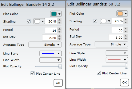 Para las bandas de 14 periodos usé 2,2 desviaciones y para la de 50 periodos usé 3,2, ¿Es esta la configuración propuesta? o ¿estoy malinterpretando?"El siguiente paso es mantener la tercera desviación típica para las bandas de período más corto y la segunda desviación en las de periodo más amplio, para que pueda obtener más intersecciones entre ambas bandas y por tanto más cruces también entre las bandas. Idealmente, los parámetros deberían ser 2,2 y 3,2 en lugar de 2 y 3 desviaciones."