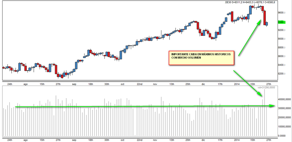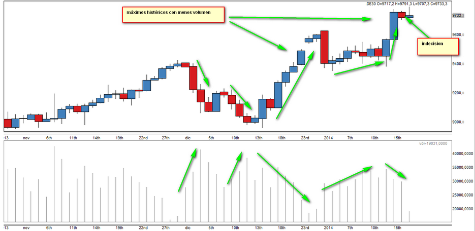 Por no abrir otro tema para pegar sólo una foto usaré este mismo sobre volumen. Estaba mirando el buen hilo de Corcha( tampoco me parece usar su hilo para poner sólo este gráfico) y me puse a mirar el volumen en el Dax Y me pareció interesante. Le he puesto algunas ideas por si alguien quiere dar su opinión, yo es lo que veo de momento, tampoco puedo ampliar mucho más porque no trabajo mucho el volumen. saludos
