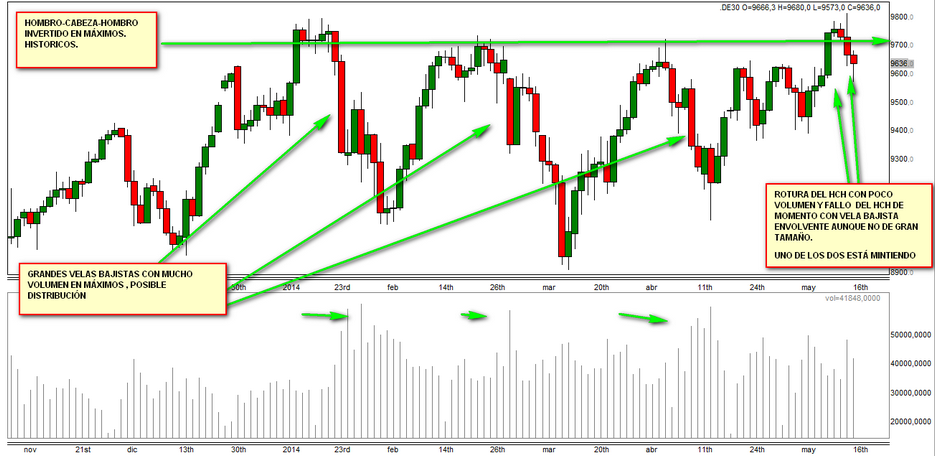Ya que en post anteriores se habló del tema continuaré pues me parece interesante echarle un ojo a la situación del DAX, tenemos un enorme HCH invertido en máximos históricos, que rompió hace dos días y que al día siguiente falló la rotura volviendo a meterse por debajo de la línea clavicular. Es interesante ver com en las bajadas han sido velas grandes con mucho volumen sin embargo la rotura y fallo no ha habido tanto volumen, igual es que ya no queda mucho por vender. Alguién está mintiendo y supongo que intentarán atrapar al mayor número de participantes antes de mostrar el verdadero movimiento. Si tenéis interés podéis mirar lo que pasó el último semestre del 2007, la forma en que se distribuyó fue muy similar y la proyección del HCH invertido fue casi perfecta. Merece la pena. Últimamente veo HCH por todas partes, no es una figura que le haya prestado mucha atención, pero las que he estudiado han funcionado bastante bien. Hace unos días tuvimos uno en el EURGBP y esta semana le estoy echando un ojo al EURJPY Y USDJPY. En gráficos diarios. saludos