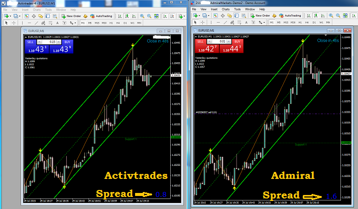 Pongo los 2 brokers con el spread y es más costoso Admiral, les hice seguimiento y Admiral se mantiene por encima de 1.0 y 1.2 y sube hasta 1.7 y 1.8 Activtrades se mantiene estable en 0.8 y puede subir a 1.0 Ver Imagen. Usen el indicador y comparan. Sin estrategia se está dispuesto a intentar cualquier cosa Porter
