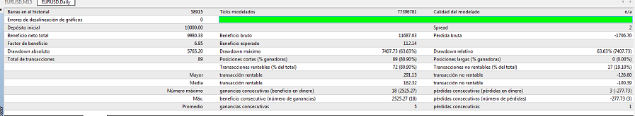 Tenia una duda respecto a como se calcula el DD (DrawDrown) en MT4. O alguien sabe que algoritmo usan exactamente? Por ejemplo pongo un par de graficas, el sistema en cuestión no entraria a debate ya que es un simple experimento de programación. Aqui por ejemplo me marca un DD de 63% en cambio en la grafica la linea de equidad (linea verde casi no se separa del balance). En teoria la equidad no seria el flotante que se tiene? En cambio con el mismo sistema pero añadiendo posiciones long y short (en el anterior solo ejecutaba shorts). Nos marca un DD de 31% y aqui si ya vemos que la linea de equidad se separa del balance con lo cual ya cuadra mas... Puede ser que en el primer caso ese 60% de DD venga de un flotante intermedio? quiero decir que en la grafica solo se refleja a cierre de una operacion, cuando cierra una operacion comprueba que flotante ahi y de ahi lo imprime en la grafica pero claro entre punto y punto igual ha habido mas flotante que seria en que marca en los datos... Un saludo.