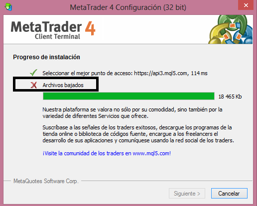 Error Archivos Bajados Restaure el Portatil a valores de fabrica y quedo con Windows 8, intento instalar todos los MT4 y siepre me arroja esto Error en archivos bajados. ¿Alguien sabe como lo soluciono?. No encuentro nada en internet. Saludos y Gracias Hay 10 tipos de personas los que entienden binario y los que no
