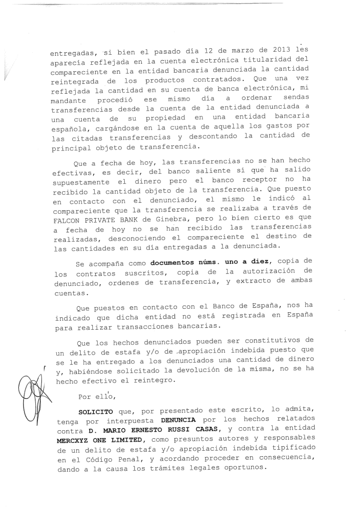 Una de estas personas procedió a presentar la correspondiente denuncia policial ante la UNIDAD CENTRAL DE DELINCUENCIA ECONÓMICA Y FISCAL de la Policía Nacional, y que se adjunta a continuación. MARIO RUSSI CASAS está citado a prestar declaración el 9 de diciembre de 2013, así que tendremos oportunidad de comprobar su versión de los hechos o la nueva historia que decida inventar. En caso de no comparecer, se emitirá una órden de BÚSQUEDA Y CAPTURA