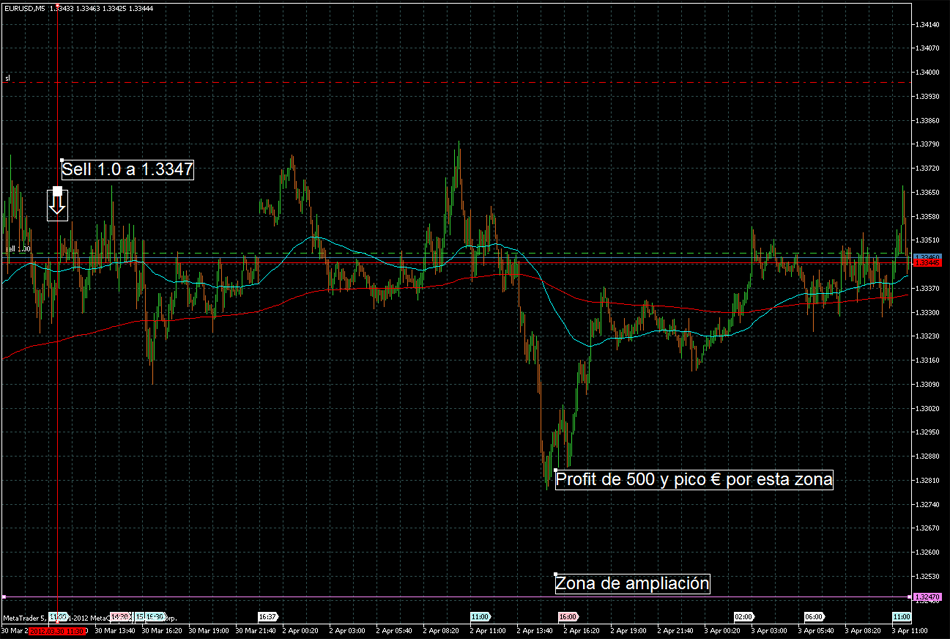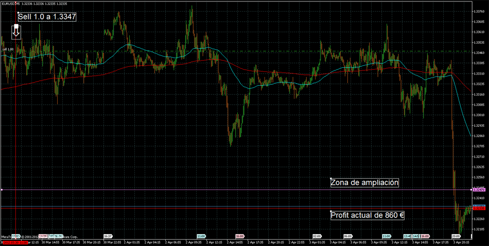 Re: Estrategia 123 - Duplicar cuenta con muy bajo riesgoPor cierto, tengo una entrada en DEMO para probar esta estrategia. He entrado con 1 lote en EUR/USD corto a 1.3347 el viernes 30 de marzo a las 11:54. De momento ha llegado a tener un profit de más de 500 €uros pero voy a esperar a ver si llega por debajo de 1.3230 más o menos, y hacer la ampliación cuando haya una buena señal de entrada en corto. Os mantengo informados.