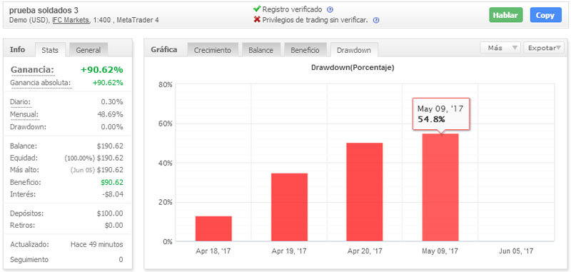 Ya vi que es lo que pasa, la cuenta que estas poniendo en la imagen es una demo que tengo puesta en mi firma y si tuvo un drowdown elevado pero myfxbook lo que hizo fue calcularlo en base al balance y no al flotante (equidad), el balance de esa cuenta paso de 100usd que fue el capital con el cual cree esa cuenta a 45.20 usd por las operaciones que tocaron sus stops loss pero el flotante (equidad) lo tenía en 190 usd y cuando yo revise esa cuenta que un día me dio por revisarla porque me había olvidado de ella vi que tenía 190usd en la equidad entonces ahí cerré todas las operaciones, eso fue en junio que las cerré y ya que estoy comentando esto del mes en el cual hice cierre global de operaciones aprovecho para decir un error que me parece que tiene myfxbook para calcular la rentabilidad mensual y es que lo hace en base al balance, si se fijan en esa cuenta yo tuve una rentabilidad en junio de un 321.73%, es una rentabilidad que a mi me parece demasiado elevada para sacársela en un mes pero aparece que fue de ese % porque al pasar el balance de 45.20usd a 190.62usd hay un 321.73%, aclaro que esa cuenta demo fue una de las tantas que utilice para poner en practica eso de dejar correr operaciones en positivo y los resultados que tiene difieren mucho de la cuenta real que estoy operando en este momento que tiene 4 meses de antigüedad, a continuación la pueden ver, es la que se llama heiken ashi2. https://www.myfxbook.com/members/danieleche/heiken-ashi-2/2294483