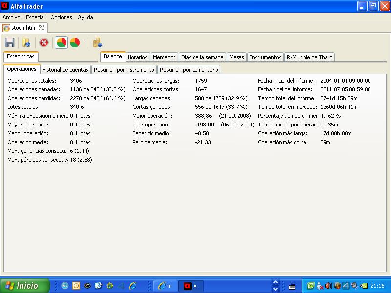 Rtrader estoy impresionado con el Alfatrader ese que tienes para comprobar las estrategias. Los valores de 12,3,7 están bien para seguir los rebotes y los cruces de K sobre D para entrar corto o largo según toque y me gustan esos valores para eso. Muy acertados, luisfran. Pero los valores de 14,3,3 eran, como dijo el compañero rtrader, para ir de cruce de 75/25 hasta siguiente cruce de 75/25. ¿Con que otro indicador lo compaginarías tú, luisfran? Yo he probado el Awesome Oscillator para buscar coincidencia en entradas y salidas y el parabolic SAR para marcar los SL. Sl2. http://navarinversiones.blogspot.com/
