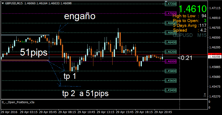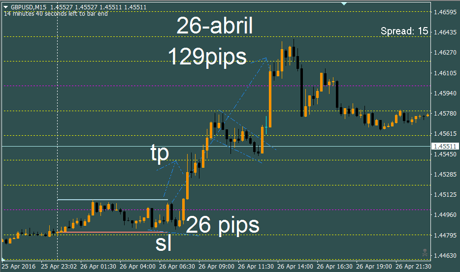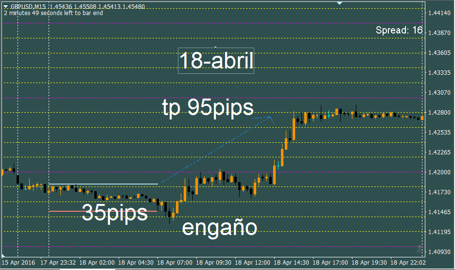 Efectivamente la estrategia del rango Asiatico hay muchas pero como yo la utilizo especificamente para esta par GBPUSD pocas y con reglas basicas ademas de ser simple y sin utilizar ningun indicador ni siquiera el price action hace falta ni patrones nada solo el precio: 1_ comprar o vender segun el precio se mueva hacia arriba o hacia abajo. 2_ SL en la parte contraria de la operacion. 3_ si el rango Asiatico supera los 50 pips no entramos que de 00:00 hasta 08:00 justo hasta la apertura de franfurt y si no lo cumple buscamos otro par con otra estrategia diferente yo solo la utilizo para este par GBPUSD. 4_ cuidado con los engaños por ejemplo habres una operacion en compra te 10 pips y se da la vuelta te salta el stop y sigue para abajo. como dices el dia 27-abril no dio los 41pips del rango solo dio 25pips que me lleve al sacar la mitad de la opercion,