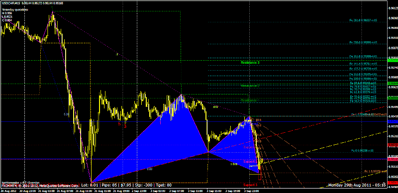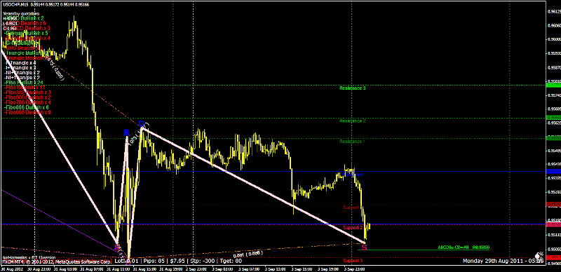 Lo utilizo en TF de 15, pero sirve para cualquiera, desde 1 minuto, hasta 1 día, semana y mes. Usualmente va a depender de tu operatoria, si quieres tener operaciones más tiempo abiertas, utiliza TF de 4 horas, si quieres tenerla por días hasta semanas pues utiliza TF más altos. Por ejemplo él puede sacarte una figura armónica en TF de 1 minuto pero la misma figura te sale en 5 min. y en 15 min. Cuando aparece una figura te saca un cuadro de color rojo, que es el espacio en donde puedes entrar a la operación, por ejemplo en este mismo momento tengo señal de entrada en compra en USD/CHF se supone que debemos ir a buscar la línea roja, eso serían unos 16 pips, el gráfico que viene es el del ZUP, luego te voy a colocar lo que me salió con el KorHarmonics (y el Elemental trader me hizo la misma figura que con el ZUP así que no la subo  )