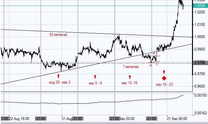 Osea, esperas que se forme nuevos maximos y minimos crecientes (si vas largo) y en el momento que haga un nuevo maximo entras (en la imagen en B), y pones un stop en el anterior minimo (en la imagen en C), no sé, es una chorrada, pero yo trabajo de una forma similar, a lo mejor esto que digo te gusta y lo puedes testear haber si mejorar tu estrategia. De esta forma siguiendo tu estrategia puedes "predecir" el movimiento que haga esa semana, y en base a esto entrar en el momento que se crea la tendencia, XD