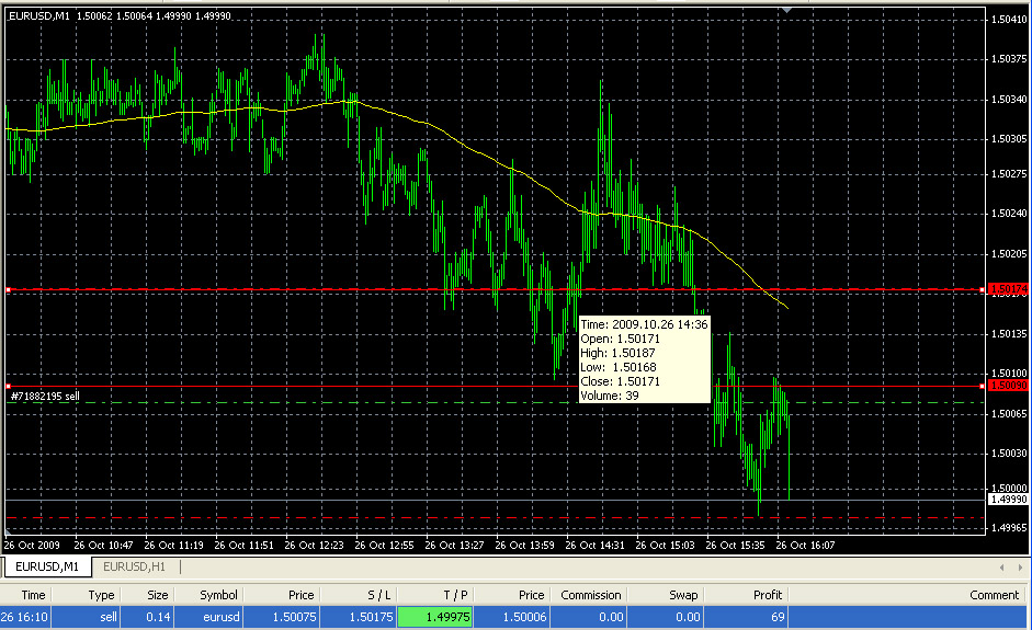 bien, el mercado no ha llegado a 1.5016, pero si que ha pasado con fuerza el 1.50 y ha subido. Como podeis ver en la gráfica he abierto una operación en corto en ese nivel con un takeprofit de 10 pips y el stoploss en 1.5017, el nivel que tanta guerra nos ha dado También como podeis ver, el par actualmente ha caido con fuerza como os comenté que podría pasar. Si veis el gráfico de 1 hora el par ha roto el soporte que os comenté también en otro post, y se está acercando a la resistencia de 1.4950. Ahi perderá fuerza seguramente ya que es un nivel que como podeis ver en el gráfico fue bastante importante en dias anteriores. Probablemente el par "rangueará" por esos niveles y ya veremos que ocurre más adelante. Si al contrario, el par sigue cayendo, hay otra resistencia importante en 1.4890