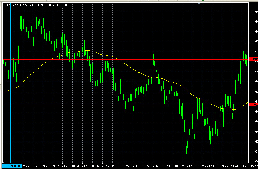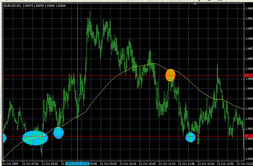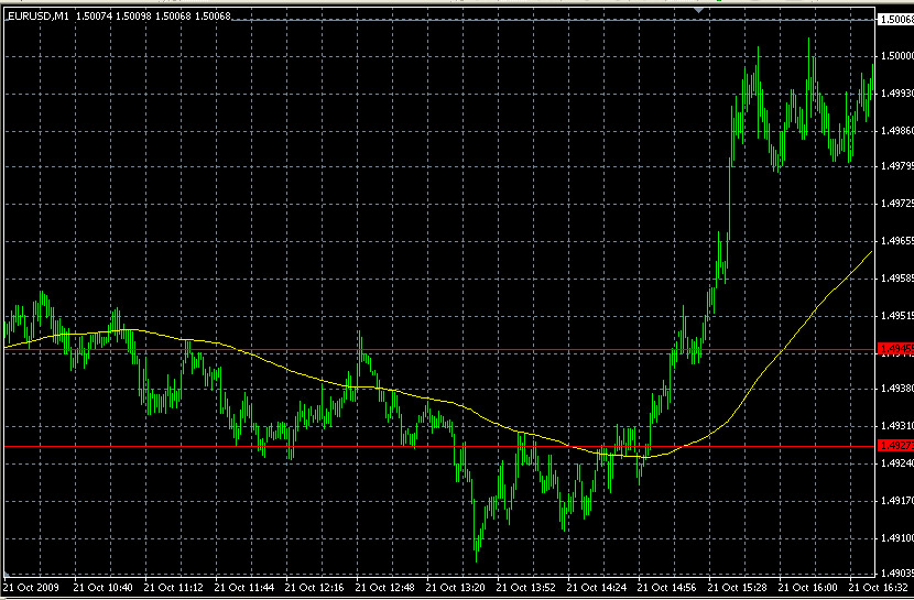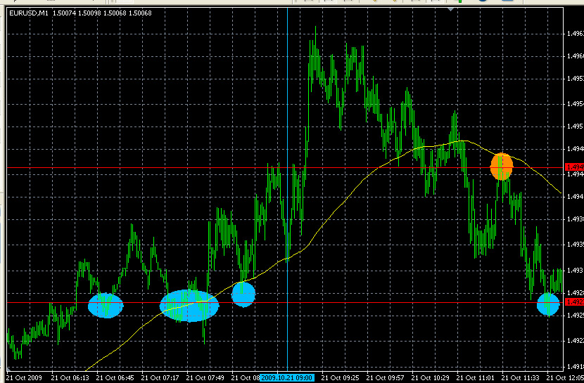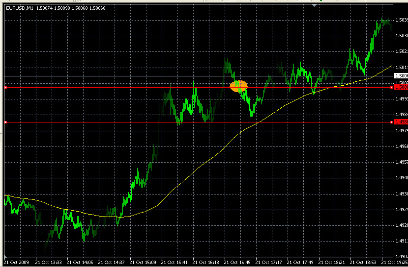 ahi va el analisis para el dia 21/10/2009 (felicidades!! jeje) advierto que el post va a ser un poco largo bien, lo primero decir que analizaré el periodo de 9 a 19 horas en gráfico de 1 minuto para el par EURUSD el objetivo de este post es mostraros donde habría entrado al mercado ese día y sobre todo discutir sobre estas entradas, qué os parecen, si estan bien, si estan mal, si se me ha escapado algo o cualquier cosa que querais aportar. ¿En qué se basa éste analisis? como ya he dicho en el primer post, usaré una WMA de 200 periodos únicamente y usaremos soportes y resistencias horizontales lo que busacaremos será el robote del precio sobre el soporte o la resistencia tras su rompimiento, es decir, si el precio atraviesa un soporte tras haber rebotado en el varias veces, esperaremos a que el precio regrese a ese soporte que previsiblemente se habrá convertido en una resistencia y ahí entraremos en corto. la WMA está para medirnos la tendencia del par. para que la entrada sea válida la WMA debe no estar plana, es decir, buscaremos que este en tendencia Veamos la primera imagen: como podeis ver, antes de las 9 el par a rebotado en el soporte de 1.4925 varias veces tras haberlo roto hacia las 6 y poco de la mañana, encontrando una resistencia al rededor del 1.4937 y generandonos un pequeño canal en rango sobre las 9 menos cuarto aproximadamente, el precio rompe la resistencia y se va al alza. esta es la primera señal que debemos observar con detenimiento. como veis, el WMA esta en tendencia alcista, es decir, esperaremos a que el precio vuelva hacia el 1.4937 y entraremos largo. como veis esto se da justo a las 9, en mi caso cuando empezaría a operar y seguramente me hubiese perdido la entrada mientras me quito las legañas y me tomo el cafe, pero bueno, sería una buena entrada (ya hablaremos de TP y SL mas adelante) asi pues, nuestra primera entrada del dia, justo a las 9 de a la mañana aproximadamente (circulo naranja) tras esto, el precio sube y nos hará otro soporte en 1.4960 aproximadamente vayamos a la segunda imagen en la segunda imagen podemos ver como la evolución del precio nos ha respetado la resistencia de 1.4960 y ha formado un soporte en 1.4945. tambien el precio está formando una resistencia descendente en los High de las velas y el WMA ha perdido fuerza. todo esto quiere decir que ahora se nos van a dar dos posibles situaciones, entramos en rango y pasado ese rango puede que suba o baje (jeje, que adivino soy) o bien directamente rompemos el soporte y el precio cae. si se da este último caso, esperaremos a que el precio suba de nuevo a tocar el nivel de 1.4945 y entraremos en corto bien, como podemos ver en la tercera imagen, el precio ha roto el soporte de 1.4945 y ha caido rapidamente para despues regresar a ese nivel y rebotar de nuevo hacia abajo. es ahi donde entrariamos en corto. ahora el nivel de 1.4945 se ha convertido en nuestra actual resistencia. tambien como podeis ver he colocado otro soporte más abajo, en el nivel de 1.4927 ¿por qué? porque coincide con los rebotes que se dieron hace unas horas como podeis ver en el gráfico dejaremos correr el precio a ver que pasa Avanzamos un poco más (grafico 4) y vemos que el precio efecticamente rebota hacia arriba y al llegar a la resistencia que habiamos marcado, vuelve a caer. al ver el grafico, claramente identificamos un canal de unos 18 pips ¿lo veis? sobre las 13:10 el precio rebota de nuevo en el soporte y ahora es hora de ver qué ocurrirá. el WMA nos indica que estamos en tendencia bajista, el precio nos sigue indicando una resistencia descendente en los High de las velas, no esta dibujada pero es facil verlo a simple vista, y por otro lado, el soporte de 1.4927. misma situacion que antes, o entramos en rango y luego a ver que pasa, o el precio cae tras romper el soporte y de nuevo la historia se repite, el precio rompe el soporte de 1.4927, sube, rebota (entramos) y vuelve a caer la entrada está marcada en el grafico 5 en el circulo naranja en el siguiente gráfico, el grafico 6, vemos cómo el precio hacia las 15:15 aproximadamente vuelve a tocar la resistencia que tenemos en 1.4945, ¿Qué ocurrirá ahora? fijaos que el WMA nos indica que la tendencia ha cambiado a alcista, entonces, debemos esperar que el precio rompa la resistencia y regrese para entrar en largo cuando toque de nuevo la resistencia, convirtiendola en soporte tambien puede pasar que el precio rebote hacia abajo en esta resistencia, lo que seguramente nos dará que el precio entre en rango y el WMA quede plano veamos que pasa en el grafico 7 bueno, pues si, jeje, el precio a roto la resistencia y con ganas ademas. como podeis ver, no ha retrocedido hasta tocar nuestra resistencia actual, asi que NO HAY QUE ENTRAR al mercado es facil decirlo pero seguro que muchos cuando vean que el precio sube tan deprisa, se ponen largos y esto, en mi opinion, no es nada aconsejable. hay que ceñirse al sistema, si no se cumple, el mercado siempre está ahi para otras ocasiones asi que simplemente dejamos que el par suba y esperamos otra oportunidad para entrar ¿veis el pequeño rango que se ha formado arriba? veamos que pasa con eso en el siguente gráfico bueno, y ahi va el ultimo trade del dia. como veis en el grafico 8, el precio rompe el pequeño rango que se habia formado para despues caer y robotar hacia arriba en la resistencia del 1.50 tambien se nos ha formado como ya hemos visto en el grafico 7 un soporte en 1.4980 como veis, el precio no rebota exactamente en el 1.50 sino que cae y casi toca el soporte mencionado, aun así, el sistema nos dice que hay que entrar ahi ya que el WMA esta en tendencia alcista y es previsible que la resistencia de 1.50 se convierta en soporte si veis cuando el precio continua, el nivel de 1.50 se convierte en soporte y el precio entra en rango creandose otra resistencia un poco mas arriba en 1.5013 aproximadamente y que más adelante es rota por el precio al alza. bueno, aqui termina
