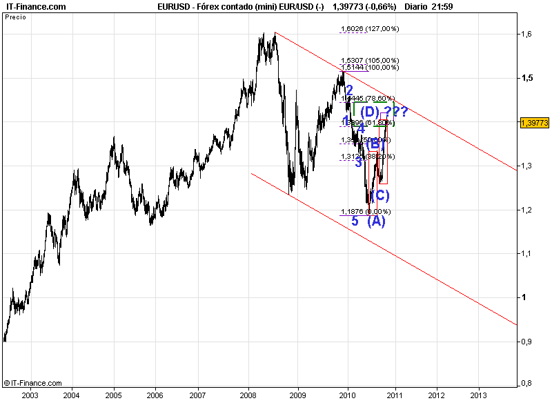 Visto así el gráfico pues parece casi contra natura que esto tenga que volverse abajo y rebasar los mínimos anteriores pero..... ......Y si añadimos este otro gráfico de mas largo plazo. Pues ya no parece tan descabellado. ¿será... no será? La solución, como siempre, con el tiempo. Saludos.