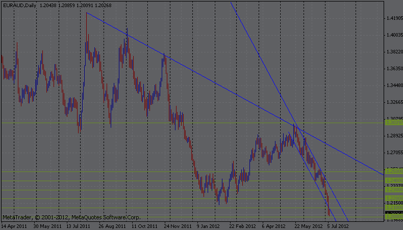 Re: EURAUD Cerca de SoportesMuy interesante lo que acaba de realizar este par el cual solo ha dado para las caidas por lo que una venta cerca de 1.2450 - 30 podria dar muy buenos resultados posible TP 1.20 ya que no tenemos referencias en estos niveles