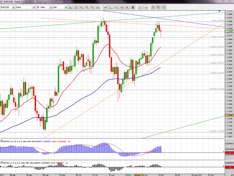 Yo también veo un panorama similar en los próximos días. Una corrección que no debería romper la LT que viene de julio (naranja)... aproximadamente sobre el 50% del Fibo (sobre el 1,36) y desde ahí hacer nuevos máximos menores. Por encima tenemos LT (alcista superior, creo que menos importante, en verde) que viene de hace dos años, y un poquito más por encima la LT de 2007 (azul). No sé si todas estas barreras van a permitir llegar al precio hasta esos 1.40... más bien parece aventurarse una compresión sobre 1,375...que rompería hacia los cortos (por estar situado el par en la parte superior de los rangos que se van delimitando con las distintas LT) Pero claro, esto desde un punto de vista meramente técnico (y muy particular)... El panorama fundamental como siempre es bastante más enrevesado. Un saludo!