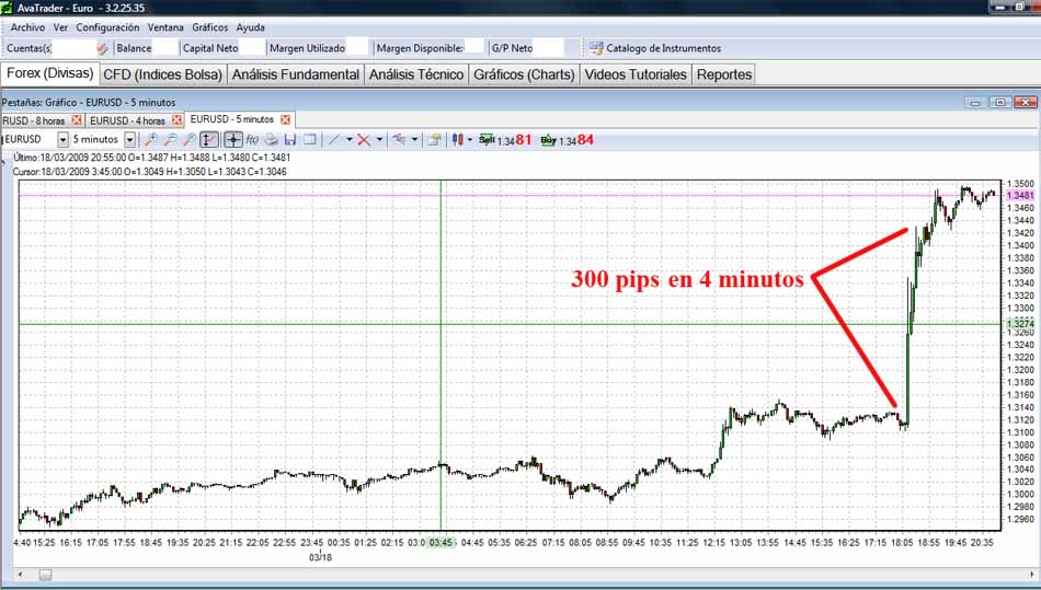 FXWizard escribió:Simplemente fueron los comentarios de la Fed en el sentido de que iba a recomprar más deuda pública para aumentar la liquidez. Si miramos el calendario macroeconomico, sabíamos que a las 19.15 h. la Fed anunciaba si tocaba tipos o no; evidentemente todo el mundo sabía que no los tocaría, así que la gracia estaba en ver qué medidas adicionales anunciaba la Fed para rescatar la economía. Mi consejo personal en estas situaciones es estar fuera de mercado, por lo menos hasta que el dato o decisión es publicado.