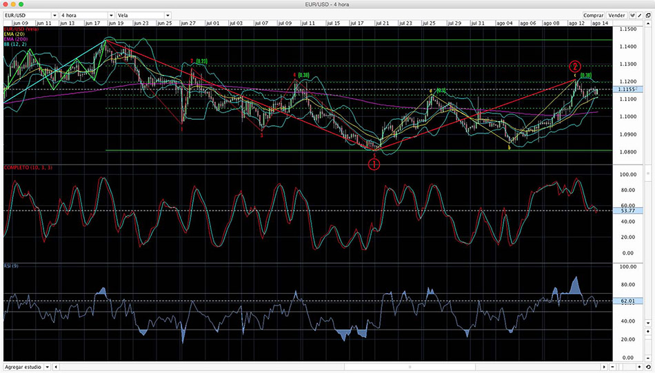 Bueno antes que nada presentarme, me llamo Borja y después de varios años con cuentas demo y algunas reales a tiempo parcial ahora llevo ya un año dedicándome a las divisas a tiempo completo. Llevo meses siguiendo los distintos hilos del foro y leyendo vuestros comentarios así que he decidido empezar a comentar también, a ver si entre todos conseguimos más puntos. Llevo todo el año siguiendo el eurusd principalmente y aquí os dejo un par de capturas del análisis que tengo sobre el cruce. El jueves llegó a un máximo diario sobre 1.1215. Mi retroceso de Fibo marcaba el valor de 1.1195 como final de la onda C y final del Zigzag de corrección que estaba haciendo (onda 2) desde el 21 de julio. Esto debería desencadenar la onda 3 bajista con objetivo en 1.0420, que quedaría invalidada por un movimiento alcista por encima de 1.1300. Las imágenes no tienen toda la calidad que me gustaría, las próximas espero poder publicarlas con más resolución. Un saludo! - Caminante no hay camino, se hace camino al andar. -