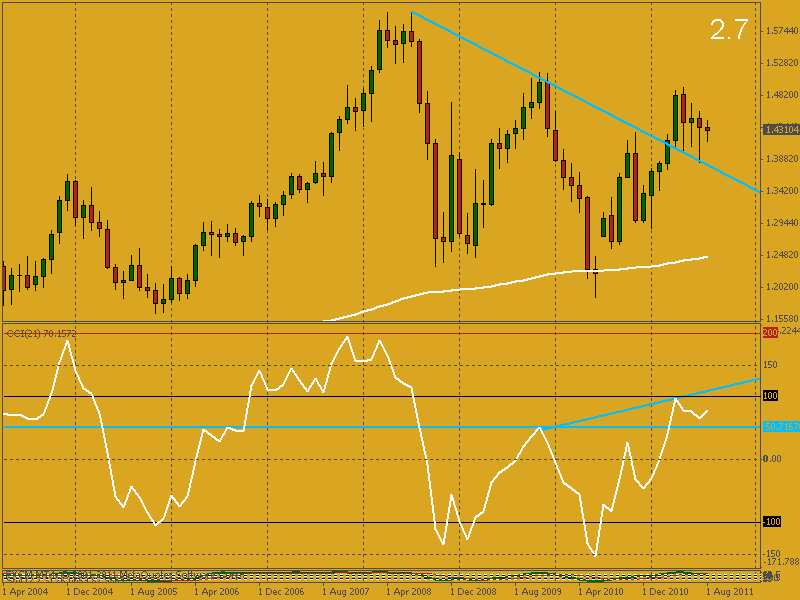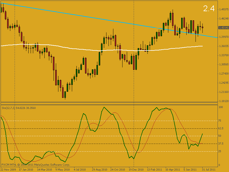Evidentemente el análisis a corto y medio plazo es necesario ya que de ahí parte todo pero es preciso aclarar que el tratamiento estimado al par en este tema es a largo plazo, a veces si basamos nuestros análisis sobretodo de 4H hacia abajo pueden dársenos señales que difieran de la tendencia de algún time frame mayor, más que nada debido a rebotes en su trayectoria. Entonces, siempre es bueno tener en cuenta que el EURUSD semanalmente permanece alcista, por lo pronto, esto es así desde que el 03/04/2011 el par rompiera la resistencia marcada desde el 31/10/2010 que a su vez dejó en la gráfica mensual una vela alcista y con decisión que quebró la importantísima línea de tendencia sellada desde el 01/07/2011. No menos cierto es que, contrapuestamente, en MN aún no se ha podido romper la resistencia del 01/11/2009 pero el precio tampoco pudo rebasar la EMA de 200, rebotando en ella con tanta fuerza que, como ya mencionamos, sí que logró quebrar la susodicha línea de tendencia alcista visible en gráficas semanal y mensual. No estaría de más tener todo esto bien en cuenta para tradear el EURUSD. Me parece que la verdadera batalla se está librando en esos gráficos mayores, una guerra lenta y perentoria que seguro influirá en muchos aspectos de la economía. Como indicaba en otros comentarios de este hilo, la situación actual es crucial ya que después de haberse roto al alza la tendencia bajista semanal el movimiento debate entre hacer efectivo el Pull Back y terminar por sobrepasar en largo el trascendente nivel de los 1.51000, o, que los osos cojan fuerza provocando una caída que se sumerja nuevamente por debajo de las líneas semanales, EMA 200 y tendencia, dejándolo todo dispuesto para que entonces sí que llegue a poder dibujarse una tendencia short semanal. La cosa es que, fundamentalmente hablando, de las dos opciones posibles y tal como pintan las cosas en EEUU…, teniendo en cuenta además las ansias de los gringos por devaluar hasta la saciedad su moneda pese a la tragedia económica que ello pueda repercutir en otras regiones como la Comunidad Económica Europea, Suiza, Japón o Brasil… Púes, un posible fortalecimiento del USD lo veo más una utopía que otra cosa. Las espadas están en alto y todo está por ver, en una Guerra de Divisas que actualmente nadie se atreve a cuestionar debido a su dramática realidad. Ya veremos a ver que pasa a partir de septiembre, nos queda un final de año movidito y un 2012 que a ver lo que depara. Por cierto, “¿será verdad lo de las profecías mayas para el año que viene?”  . Saludos.