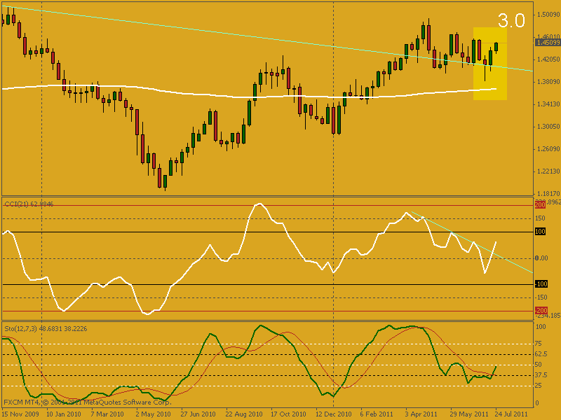 Fíjense en el patrón de velas que se está formando justo por encima de la EMA 200 y colindante a la línea de tendencia dibujada desde el 01/07/2008, tiene toda la pinta de Pull Back alcista y dada la situación del mercado donde se encuentra toda esta parafernalia nos podremos imaginar lo que eso significa. Como indicadores de apoyo tenemos al Stochastic, del mismo modo, realizando cruce alcista. Y, al CCI que coincide conjuntamente con el Stochastic en un quiebre al alza, respecto a la tendencia bajista que traía, colocándose nuevamente por encima del nivel 0.00. De todas maneras, habrá que esperar al fin de semana para confirmar el dibujo de la última vela. Ya saben, los mercados siempre tienen la última palabra, saludos