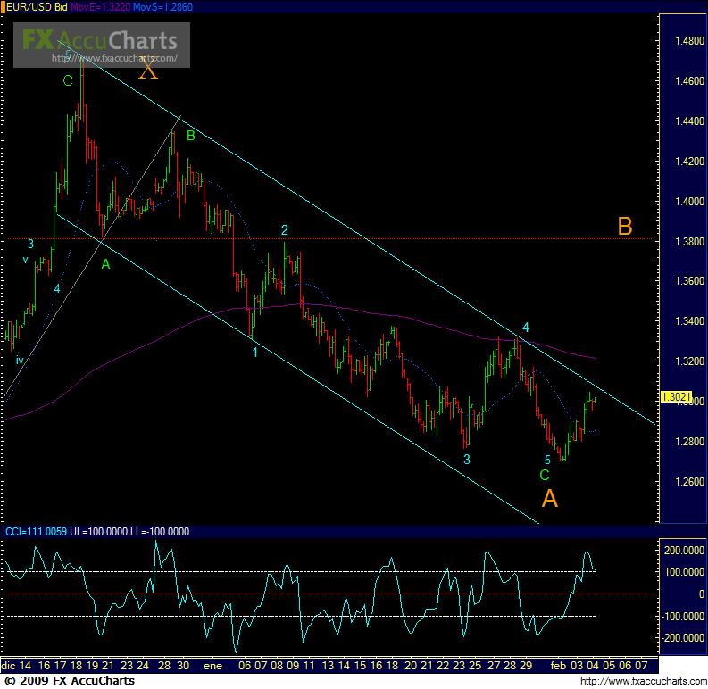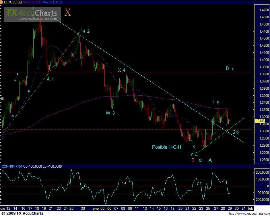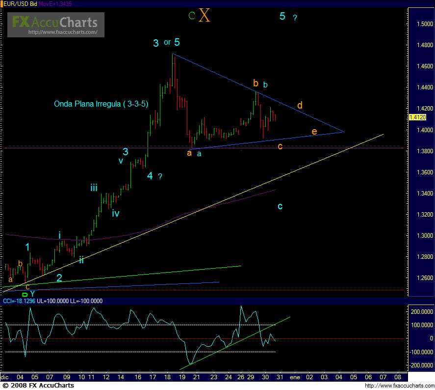 Re: Alerta EUR/USDDespues de el par romper la linea de tendencia q traia bajista conjuntamente con los ultimos mov , sigo pensando q todo este movimiento desde su caida del 1.60 es una correccion Doble Zig Zag( A-B-C(W) -X-Y) donde la cifra del 1.4723 aparentemente es la Onda (X) y a partir de ahi ha dado comienzo a la Onda (Y) y ultima de este mov bajista, dicha onda (Y) debe estar compuesta por un (a-b-c) interno y hasta ahora es lo q parece estar formando.Segun este conteo el mov q ha realizado el par despues de romper dicha linea de tendencia bajista parece ser parte de la onda (b) de ese (a-b-c) la cual podria terminar en la zona del 1.39-1.40 y desde esa zona el par podria empezar a caer para completar la onda (c) de (Y) la cual podria estar ubicada en la zona del 1.1650 aproximadamente.Existe una segunda posibilidad y es del q el par sobrepase la zona del 1.40 y vaya a buscar la zona del 1.54 , pero en este caso entonces su futura caida seria mucho mas abajo , hasta el 1.12 aproximadamente.Suerte