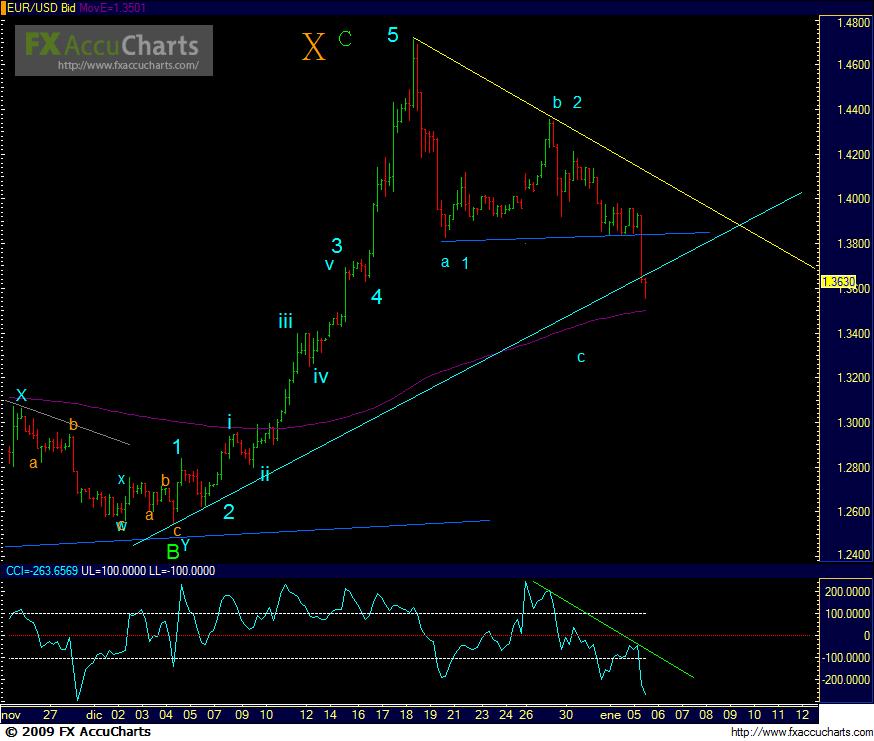 Re: Alerta EUR/USDEl par EUR-USD despues de romper el soporte del 1.3824 nos indica q entonces el conteo q traiamos como base es el q estaba en lo cierto y por ende es muy posible q el par haya terminado la onda (X) y se este dirigiendo hacia cifras menores para terminar la onda (Y).Como dije en el post anterior creo q su objetivo a mediano plazo es la del 1.3250 y posteriormente deberia caer a buscar la zona del 1.1650 aproximadamente la cual deberia ser posiblemente su ultimo mov bajista antes de empezar a buscar nuevos maximos ( largo plazo).Suerte