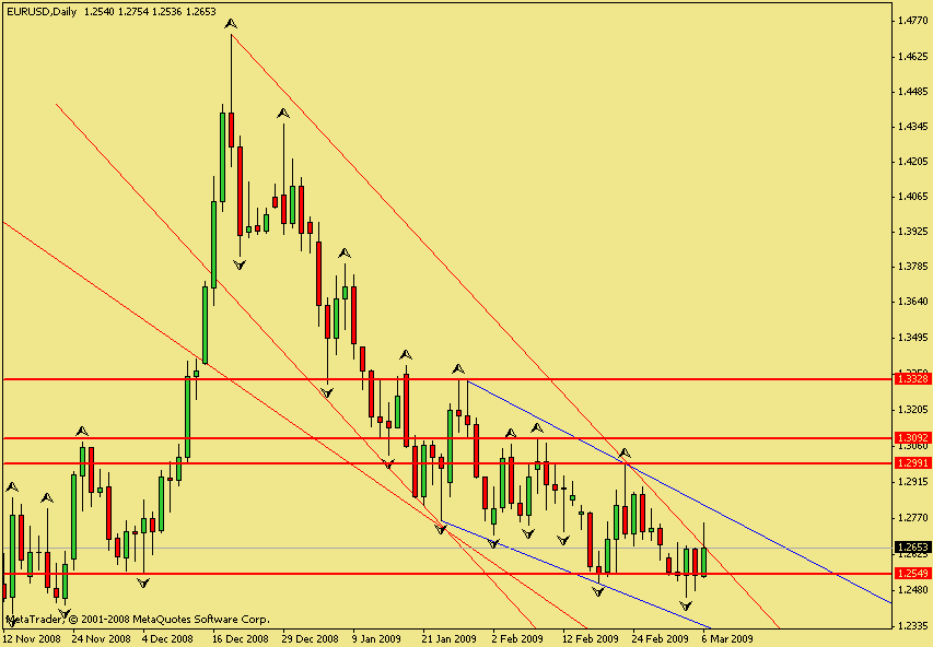Qué está pasando con el EURUSD?Después de que el par hiciera su ultimo alto en 1.4719, realizó un retroceso, como es normal, que lo llevó a buscar el Soporte dejado por ésta subida en 1.2549 dejando un bajo en 1.2456 y ya esto si no es tan normal porque no debió retroceder tanto. Pues bien, sucede que el para se ha enfrentado en dos ocasiones a éste Soporte (1.2549) y no ha podido cerrar por debajo de el en gráfico diario, y esto tampoco es normal ya que después de semejante bajada (cerca de 2.270 pips) debería romperlo, sino en la primera ocasión si en la segunda.