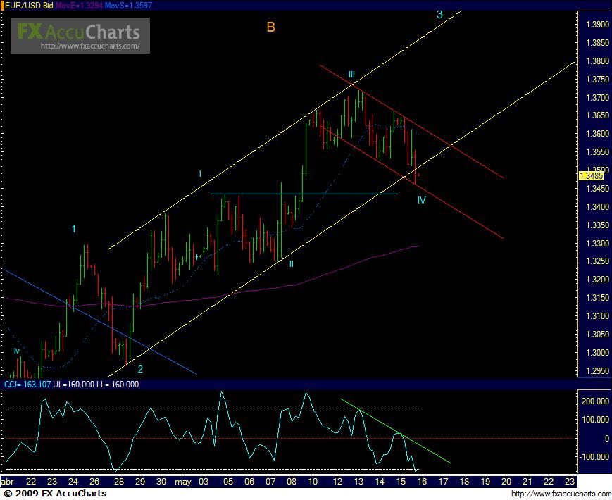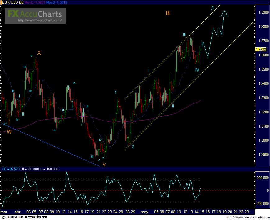 Bueno el par se encuentra en estos momentos en el pricipio de la onda 3ra de (B) , concretamente en este instante el par parece estar en la sub-onda primera de dicha onda (3ra) , la misma quizas llegue hasta la zona del 1.37 aproximadamente y desde alli de comienzo a una correccion q seria la sub-onda segunda para posteriormente arrancar nuevamente en busca de la zona del 1.39 donde deberia estar la onda (3ra) mencionada anteriormente.Suerte