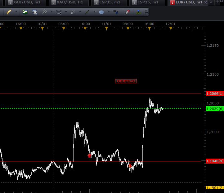 Al final esta mañana el precio se bajo a -36 pips y debido a que el día me iba a ser difícil hacer seguimiento del precio decidí cerrar y quedar en BE con respecto ayer, al final ahora que he visto como se ha desarrollado el día parece que el precio en cuanto me desprendía de los contratos hizo doble suelo y para arriba como un rayo.....en fin..... Llevo 7 años y algo estudiando como calcular el mejor precio. Cuando el precio llegaba luego a mi cálculo después de esperar horas o dias, me daba a aveces muchos pips, otros unos pocos y otras veces se rompía y me tocaba palmar..... Haces unas semanas le dí la vuelta a lo que hacia desde hace 7 años y empezé a ver el mercado a nivel negociación. Ahora, calculo el precio al que el producto (en este caso el EUR) va a llegar en esa semana, SI o SI y mientras el mercado no alcance ese precio , ya sea por arriba o por abajo.......todo alejamiento lo veo como una mejora de precio y cuando llega a 100 pips empiezo a operar en dirección la punto calculado. Esta semana el precio objetivo es 1,2066 y por tanto por eso entré en ese punto alrededor de 1,1948 pues ya tenía una distancia a objetivo de 100pips. Y hoy de no haber cerrado me hubiera embolsado los malditos 100pips que llevaba esperando toda la semana. Si luego el precio sube por encima de 1,2066, ahí ya es cosa para otros, pues mi negocio estaba entre 1,1948 y 1,2066. La semana que viene habrá +