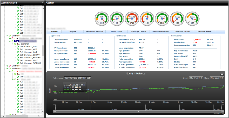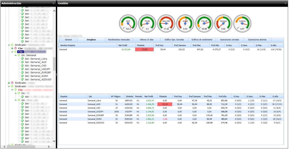 Ok, gracias FXWizard, En primer lugar remarcar que el software será gratuito para uso no profesional. Que hace este software?: Será una versión evolucionada de mi laboratorio de EAs. Este laboratorio está diseñado para trabajar en forward. Actualmente no sirve para hacer backtest ni para obtener datos estadísticos a través de statments de metatrader ya que para ello ya existe software incluso gratuito para hacerlo. Pero lo que no hay es un software que “vigile” nuestra cuenta a medida que va evolucionando en tiempo real o sea, después de decidir que vamos a poner en demo o en real nuestros EAs, en una o varias cuentas, con uno o varios sets. Os pongo una lista de las actuales prestaciones: * Posibilidad de asignar expertos y sets a una cuenta. * Alarmas configurables sobre el flotante negativo y sobre profit. * Alarma de desconexión de la cuenta. * Configuración de la velocidad de refresco de los datos en pantalla. * Visualización de múltiples valores estadísticos, ratios, coeficientes, etc. * Gráfico de Equity/balance con equity flotante intra-orden por intervalo de tiempo. * Desglose de expertos y sets donde podemos ver: * Valor del flotante intra-orden por cuenta, expertos o sets * Profit de hoy, semana, mes o año en curso, por cuenta, expertos o sets * Número de operaciones: total realizadas, buenas y malas de hoy, semana, mes y año en curso por cuenta, expertos o sets * Rendimientos mensuales por año, por cuenta, expertos o sets * Rendimientos de los últimos 15 días, por cuenta, expertos o sets * Gráfico de profit neto en operaciones cerradas, por cuenta, expertos o sets * Gráficos de rendimiento: * Trades por hora (de la cuenta, por experto o por set) * Trades por día (de la cuenta, por experto o por set) * Profit por hora (de la cuenta, por experto o por set) * Profit por día (de la cuenta, por experto o por set) * 10 Máximos drawdowns en porcentaje e importe (de la cuenta, por experto o por set) * Número de operaciones de recuperación de los últimos 10 drawdowns (de la cuenta, por experto o por set) * Tiempo en mercado de las órdenes (de la cuenta, por experto o por set) * Lista con filtros de operaciones cerradas * Lista con filtros de operaciones abiertas Os pongo algunas imágenes de cómo está estructurada la información actualmente. Si tenéis alguna sugerencia al respecto lo tendré en cuenta para añadirla siempre que no afecte a la estructura actual y que no me suponga un trabajo titánico. El software estará listo en unos meses ya que actualmente está en fase beta, probando todas las opciones y reparando los errores que van surgiendo. En cuanto añada vuestras sugerencias, y pase todas las pruebas para confirmar que la versión es estable, lo pondré de forma gratuita a vuestra disposición para que lo uséis siempre que sea para un uso no profesional. Espero vuestras sugerencias. Salu2 Algunas de las ventanas actuales: