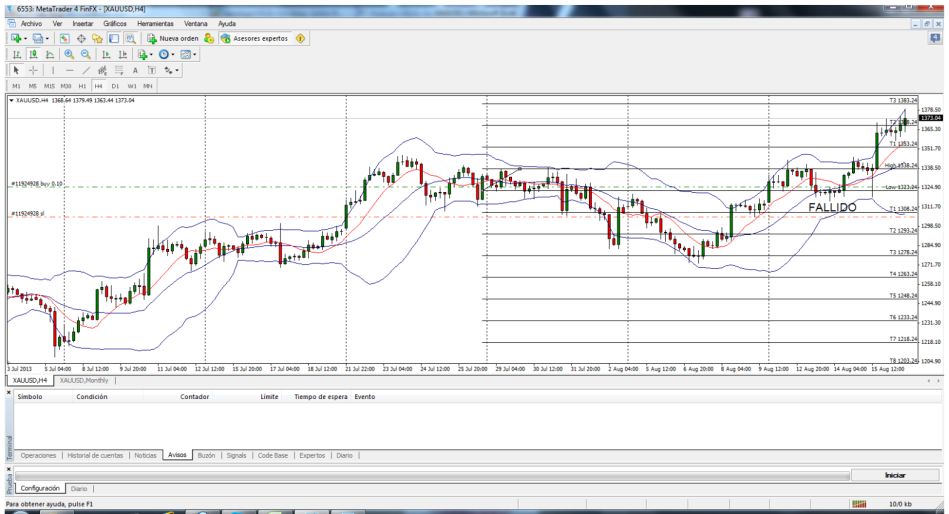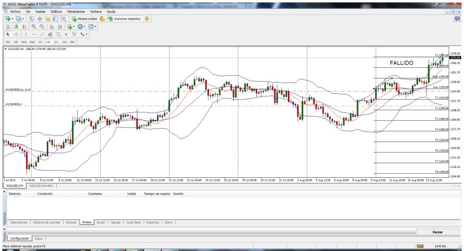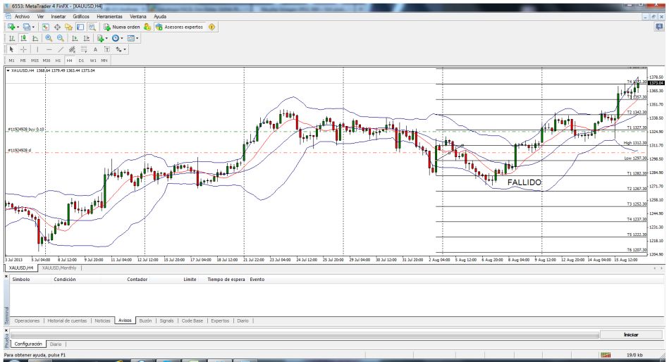 Gonzalox escribió:Isis81 escribió:Resultados semana 29/07/13Posiciones pendientes: - Buy stop: 1338,24 + 1,00 + spread = 1339,24 + spread. SL: 1338,24 – 15,00 – 1,00 = 1322,24. TP (Target 2) = 1368,24. - Sell stop: 1322,85 – 1,00 = 1321,85. Stop: 1322,85 + 15,00 + 1,00 + spread = 1338,85 + spread. TP (Target 2) = 1292,85. 29-07-13 es.jpg Esta semana, el resultado ha sido positivo: 15,00 X 2 – 1,00 = + 29,00. Posiciones pendientes: - Buy stop del 29/07: Cerrar el 23/08. Se ha cerrado el Sell stop del 08/07. Excel: XAUUSD.xlsx Hemos comenzado agosto. Así que a por el T9.