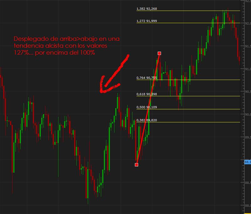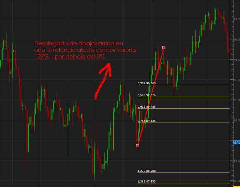 Re: Forma de desplegar FibonacciFeznandoo en realidad es mucho más sencillo de lo que puede parecer. Tal y como mandan los cánones del análisis técnico, si deseas calcular retrocesos de una subida, simplemente haz click en el mínimo donde se inicia la subida, únelo con el máximo y ya lo tienes; si por el contrario necesitas calcular los retrocesos de una bajada, simplemente haz click en el máximo desde el que se inicia la caída, únelo con el mínimo y listo. Si lo haces a la inversa, los niveles que obtendras serán los mismos pero los porcentajes de los retrocesos se invertirán y las proyecciones (161.8%, 261.8%, etc.) te aparecerán en el lado contrario.
