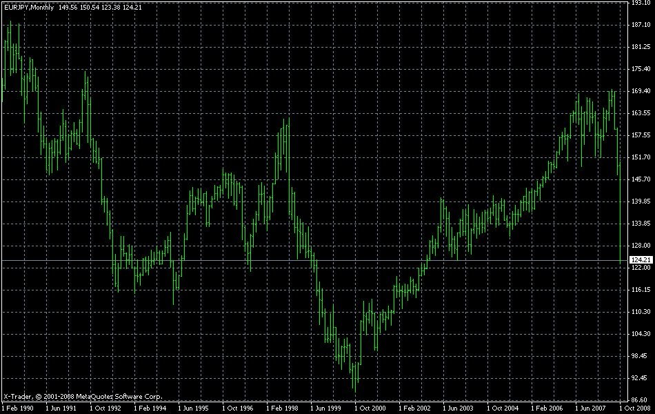 Hola Creo que FXwizard tiene toda la razón. En general, los directores de banco no tiene mucha idea de como funciona esto del forex, algunos incluso no saben ni como funciona una hipoteca multidivisa que se ofrece en su propia entidad. Yo siempre he recomendado a mis amigos que en caso de hacer una hipoteca multidivisa tomaran la siguiente precaución. Si la letra en euros me iba a costar 1000 € y en yenes me sale por 700 €, cada mes debo ingresar por lo menos 900 €, de modo que la diferencia entre la letra que me venga (cada mes será distinta por la fluctuación) y lo que ingreso lo metes en una cuenta de ahorro que te genere unos intereses, aunque sean pocos. Cuando la moneda me favorezca puedo coger esos ahorrillos y comprar yenes a mejor precio que hice la hipoteca y hago una cancelación parcial de la misma para ir reduciendola. También puedes seguir manteniendo el ahorro para el mes que venga peor el cambio tirar del ahorrillo que he cambiado antes a mejor precio. DE cualquier modo supone estar minimamente pendiente del mercado, pero vamos liquidando hipoteca a mayor velocidad. En tu caso no se a que cambio hiciste la hipoteca y cuanto le estas perdiendo por el cambio, con las actuales condiciones de mercado no sabria predecir un piso para el par EUR/JPY, y una vez que lo alcance puede tardar meses o años en volver al precio al que entraste, aunque dado el panorama nunca se sabe, lo mismo pasa algo en EEUU y se recupera en un par de meses. Lo que podras ver es que no es el comportamiento normal del mercado lo que ha pasado en este ultimo mes, y que dado que los tipos en europa estan bajando puede que el par tarde algun tiempo en recuperarse debido a la menor diferencia de tasas de interes. Te cuelgo un grafico de como ha estado el par en los ultimos años para que te hagas una idea. Creo que tu decisión se tiene que basar en cuanto te afecta en el bolsillo cada mes, porque la hipoteca no es para dos dias, y deberias tomar alguna precaución si decides mantenerte con la operación en yenes. Antes o despues se va a recuperar, pero tienes que ver comparativamente como te sale la letra y el desglose de la misma. Tienes que ver si te mantienes cuanto pagas, y cuanto de eso que pagas va destinado a quitar prestamo y cuanto a intereses en cada caso. Para mi una de las grandes ventajas de una multidivisa en yenes es que, ademas de que la letra es menor, reduces el valor prestado en mayor cantidad cada mes. Si ademas haces lo que te describía al principio te puede salir muy rentable. Otra de las cosas que se debe mirar es en el medio plazo cuales son las perspectivas de que segun la moneda usada mi hipoteca tienda a ser cada vez mejor o que tienda a ser cada vez peor. El que sepa esto lo tiene muy fácil, pero es lo que es dificil saber.