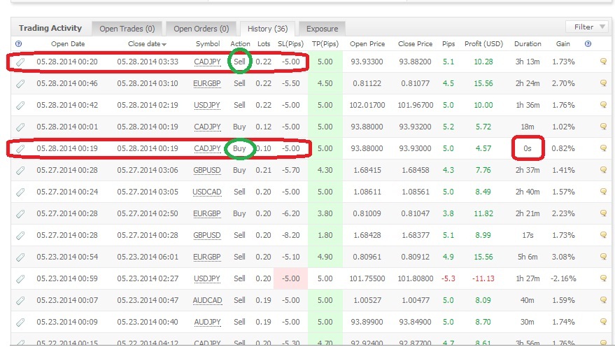 Andrest escribió:Yo lo que haria es dejarme de rodeos y ponerlo en real YA!, si eso bajarlo "a escala" y hacerlo con un capital de 50 dolares y comenzando con 0,02 lotes en lugar de 0,2 y 500... Como mucho la broma te saldrá unos 35 euros y tendrás porfin algo FIABLE de verdad. Hay cosas que a mi no me cuadran de lo que pone myfxbook, por ejemplo anoche tuviste una operación que duro 0 segundo... y prácticamente al mismo tiempo, con solo un minuto de diferencia abrió una operación contraria. Si vamos al grafico, en ese horario no hubo ninguna vela de mas de 5 pips a ambos lados como para que abra venta y compra en la misma vela o vela 1 y siguiente y gane... sobre todo no me cuadra la de compra que solo duro 0 segundos mfx7494.jpg