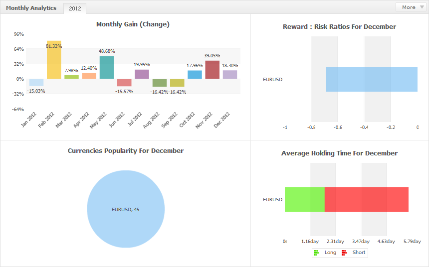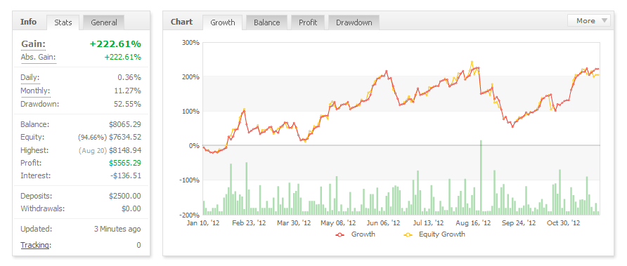 Creo q mi post llega 1 poco tarde (pero mejor tarde q nunca Daykoku, en el resultado de 12 meses q ves, es con la configuracion "default" q recomienda el creador del indicador. Yo me he basado en ello, NO he usado martingala, ni seguidor de tendencia, ni osciladores ...etc. He hecho backtest desde 2005 y lo he posteado aqui, en este hilo ...solo hay q encontrarlo Si Luis, DD es bastante algo, se debe del loteje, xq no se ajusto bien acorde a money mangement. Mis backtests estan x aqui ...buscalos Despues de 12 meses hay bastante datos para analizar y ajustar cositas. Como se ve claramente q hay dias conde se gana o/y pierde 1 monton. Eso se debe q hay epocas donde el precio durante dias se esta consolidadando y no llega a la linea TPs o SL, pero EA cada dia ejecuta nueva orden directa (pendiente) entonces cuando el precio rompe, tendremos ese resultado de lo q hablo. Ya tenemos la solucion q hacer en esta ocasion ...(No Target Reached = No Trade) Y x fin aqui esta el resultado final del ano 2012. Bueno gente, os deseo mucha suerte y green pips ...q os vaya bien!! Salu2 ...PiTeRMaN