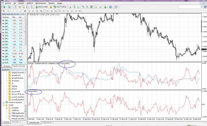 Tengo pendiente averiguar cómo se programa el overlay de estos indicadores que vienen de serie en Metatrader, si lo averiguo lo posteo por aquí. Mientras tanto, y para salir del paso, puedes meter unas bandas de Bollinger que a efectos prácticos te van a dar la misma información (cuando se salga el Pairs with Beta de las bandas significará que aproximadamente el ZScore se está saliendo de +/-2) como puedes ver en este ejemplo: Saludos, FXWizard