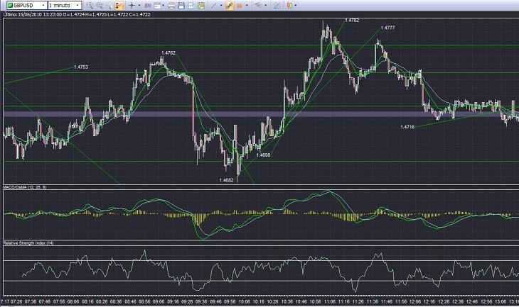a las 7:34 parecía haber roto el swing anterior lo que me hizo pensar que la tendencia continuaba, inmediatamente me arrepentí de esa decisión cerrando la posicion con perdidas. -1$ a las 7:34 rompe linea de tendencia bajista me pongo largo y tocado aún supongo por la mala desición anterior y al no verlo muy claro cerre la posicion enseguida. con una ganancia ínfima. + 0,50$ a las 7:49 me puse corto cerrando enseguida la posición afortunadamente no hubo daños. +2$ a las 8:10 abri la posición en una zona de congestión asumiendo quizás un riesgo muy alto. (saltó mi stop en 1,4724) -5,50 a las 8:14 rompe el swing anterior y entro quizas mi stop estaba muy cesgado (volvió a saltar stop 1.4719) finalmente dejo un poco de operar un rato y observo una cierto atisbo de rango espero a un nuevo maximo y me meto corto al romper linea de tendencia alcista puse stop detras de swing anterior y deje la posicion correr hasta 1,47 minimo del rango y doble cero. esta jugada me salio bien y salvó todos mis fracasos anteriores. + 26,50. despues de alcanzar el minimo fijado voví a precipitarme supuse que seguiría hacia abajo y volví a entrar corto perdí. ahora parece lo que es una decisión precipitada. -16,50 por ultimo vi el precio crecer hasta los máximos anteriores el rango se me antojó mucho más claro me metí corto en una posición de cierto riesgo con un stop que consideraba bastante holgado, la realidad fue distinta vino un barrido de esos tan monos y me hizo saltar el stop. -12,00 la ultima carta me la jugue al identificar el barrido entre corto de nuevo despues del fleco asumiendo tambien bastante riesgo pero con un stop mucho más cesgado, despues aguarde rotura de linea de tendencia, confirmación, retroceso y meti un contrato más. Se hizo de rogar pero al final se fue hacia abajo pude mover mi stop a 1, 4755 cerré los dos contratos antes del objetivo 1,4700 por encontrar una fuerte resistencia en 1,4730 y divergencia macd. +34.50$ mi balance no está del todo mal, a pesar de todo,pero mi dia a dia esta siempre alborde de la catastrofe, por ejemplo no hay dia que no cierre por lo menos una posición en negativo. es más la mayor parte de mis entradas son malas lo que pasa es qaue después la buenas compensan las pérdidas y me dan algo de ganancias. en fin evidentemente fallo en algo.